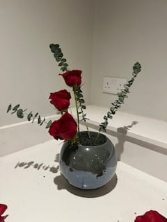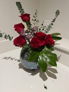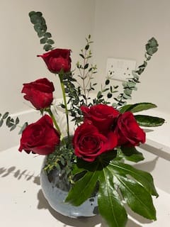 Approx 6 red roses from the supermarket, or other focal flowers such as gerbera, carnations or lisianthus.
