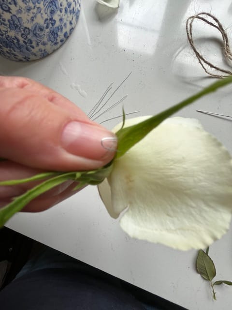 Cut some thin floristry wire into lengths of no more than 1". These will be used to position the sepals of the flowers to prevent the rose from opening further.