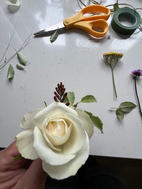 I next added the freesia bud also behind the rose with the pittosporum.