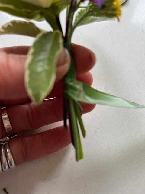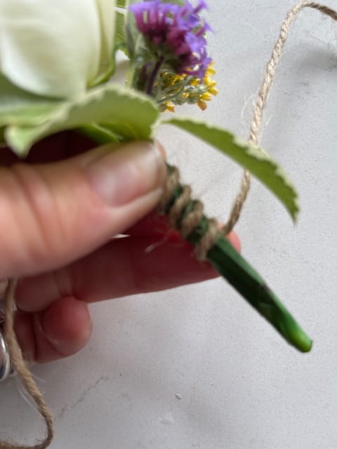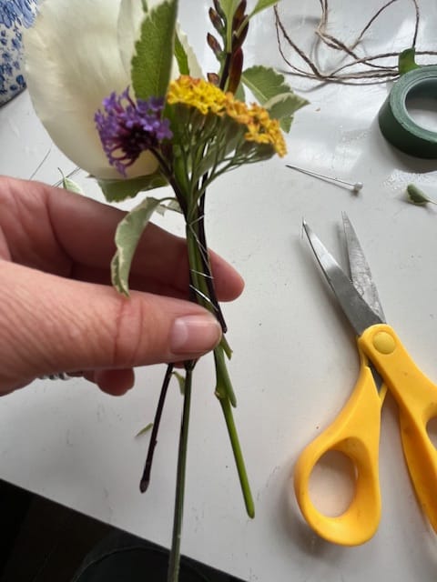 Taking a piece of long wire and leaving a shorter end of approx 2", wrap the longer length around the stems twice firmly to secure but not to tight to damage the stems. Twist the short and longer end to secure the wire and with the remaining length twist it around the remaining stems as shown below,