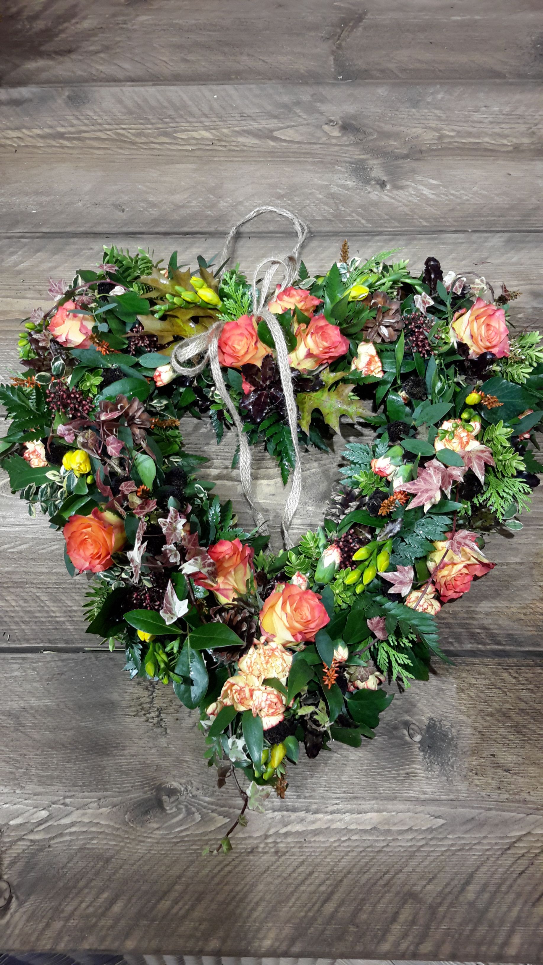 Autumanal colours for this heart wreath to hang on your door. Orange and yellow toned roses and spray carnations, yellow scented freesia, red skimmea berries and a variety of foliage. A little trickier to make, ensuring the shape of the heart is kept.To create this rustic autumnal wreath I used hydrangea flowers, green skimmea berries, trailing ivy, contorted willow, seed heads, catkins and garden foliage.