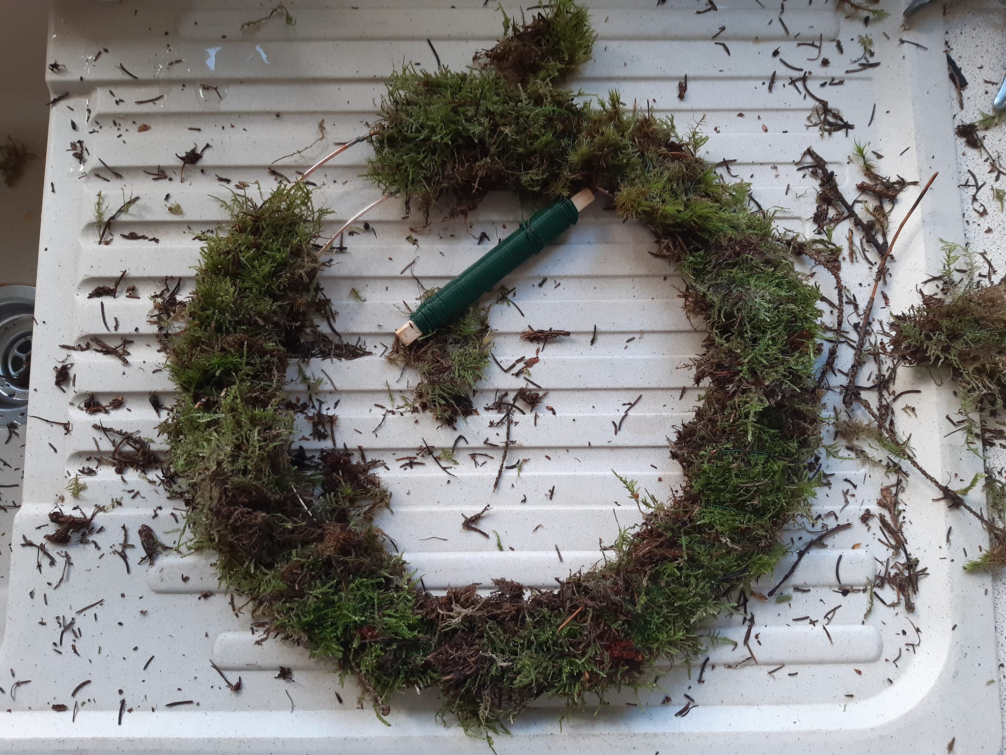 An environmentally friendly wreath ring being mossed up in preparation.Demonstrating how to make a wreath at a local Christmas fair.