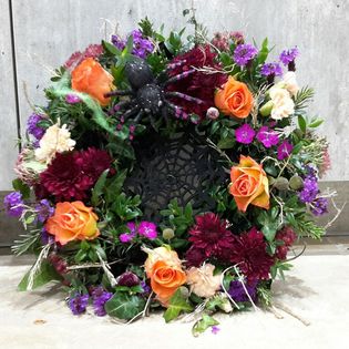 Spiders, bats, bracken, tree ivy, red berries, seed heads, conifer, and spruce for this scary display!Spooky halloween colours, orange roses, red crysanthemums, purple verbena, pink sweet william and ghostly white spray carnations.