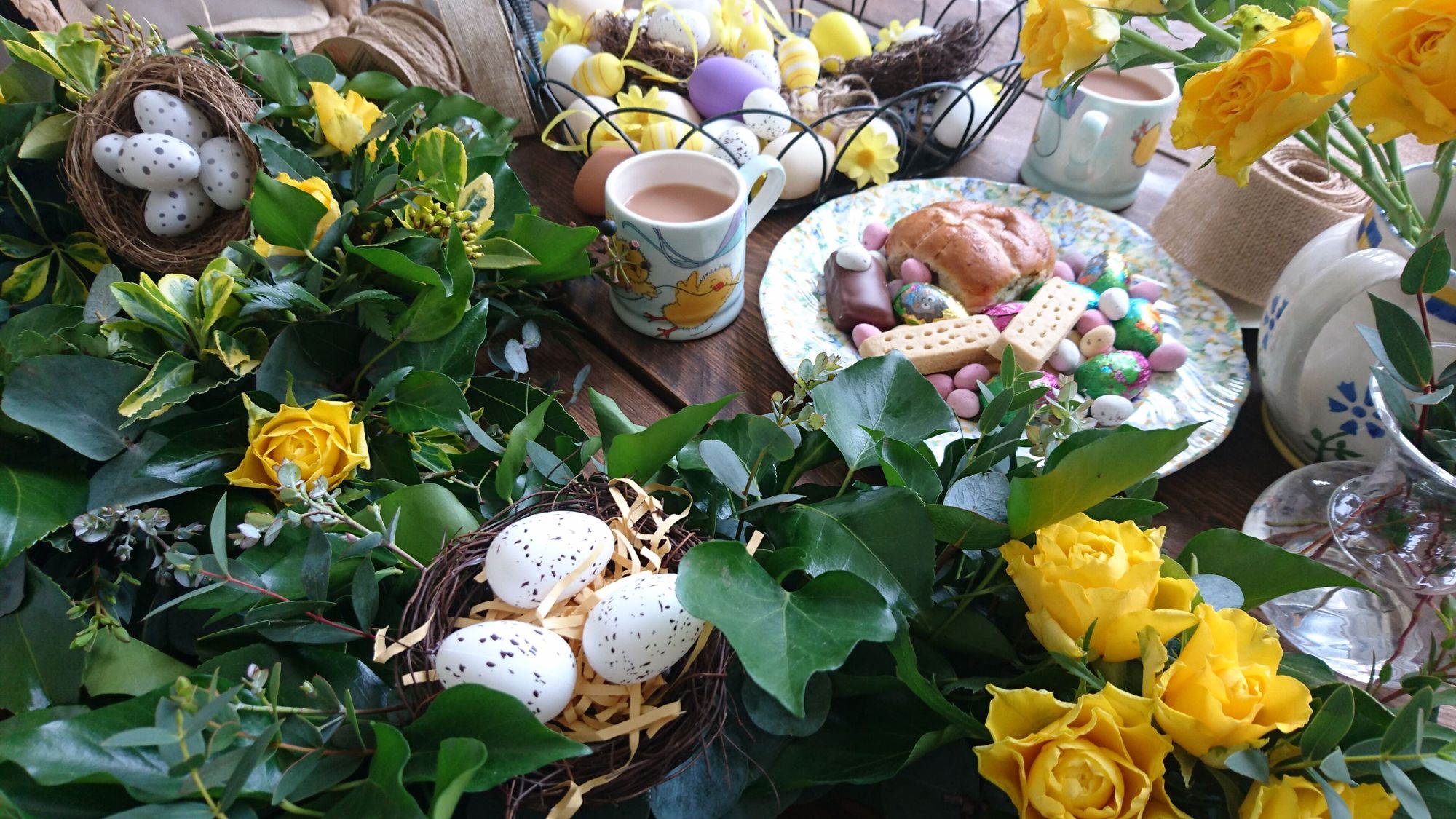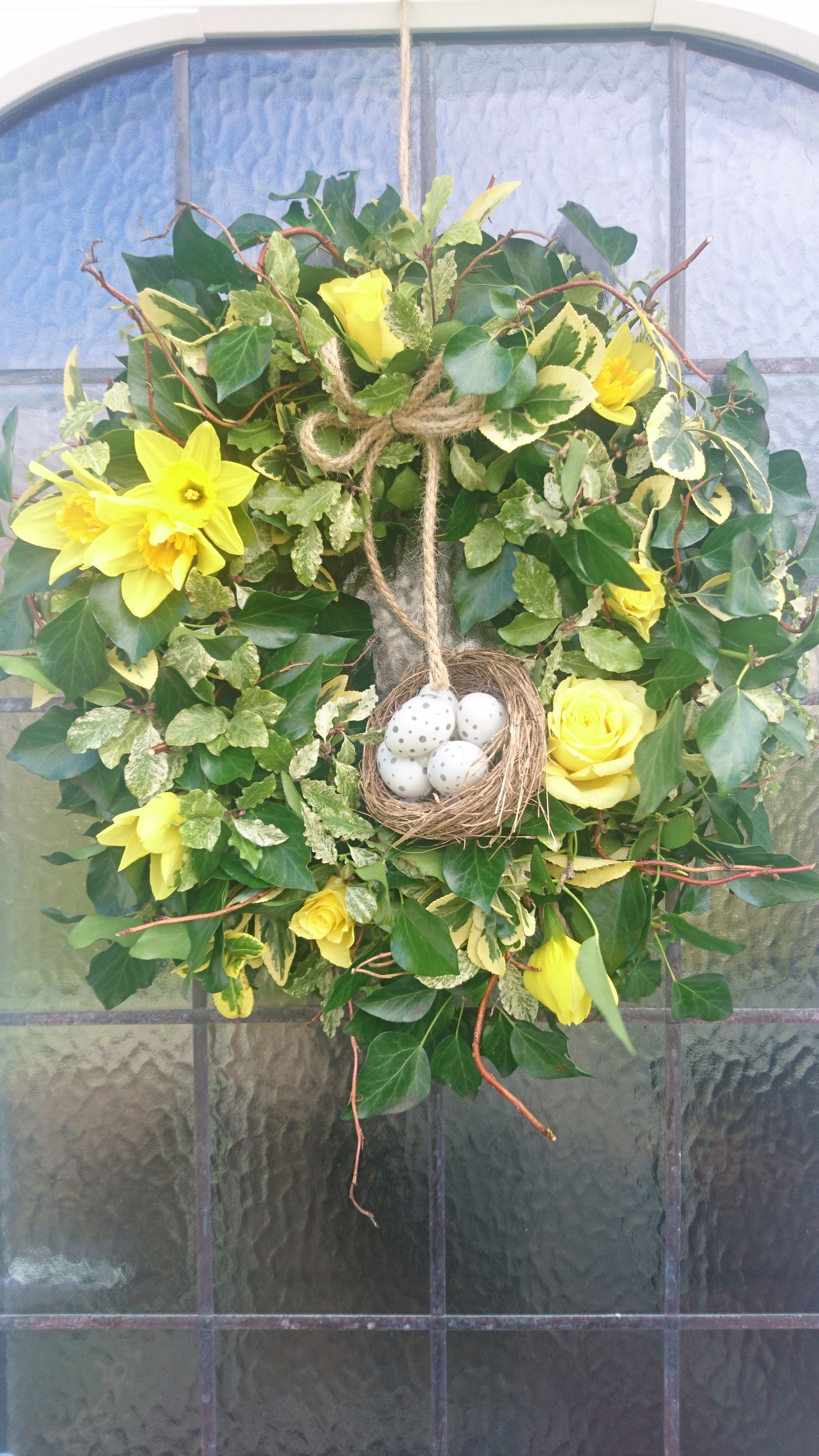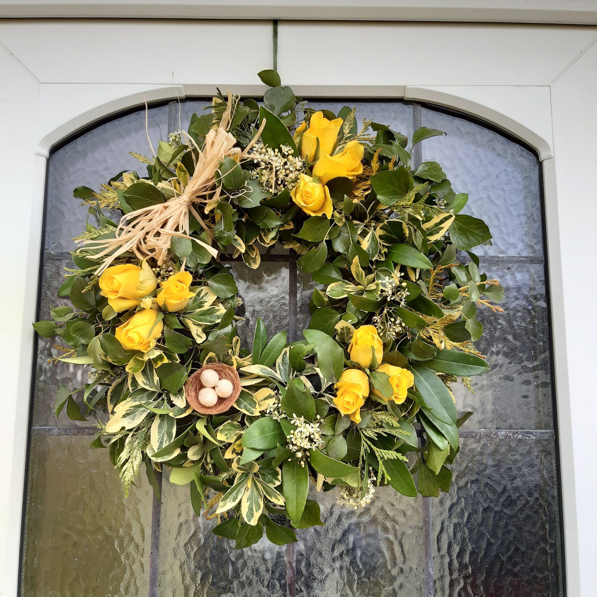 Covid didn't put a stop to an Easter wreath workshop. I zoom called my neighbours and taught them how to create their wreaths via video tuition!Groupings of yellow roses which pick out the varigated foliage within the wreath, topped off with a raffia bow.An easy to make Easter door wreath which includes, tree ivy, varigated eunonymous and pittosporum. Contorted twigs add texture and movement with yellow roses and daffodils adding a pop of colour.Hot cross buns, chocolate eggs and biscuits served at the midway point.